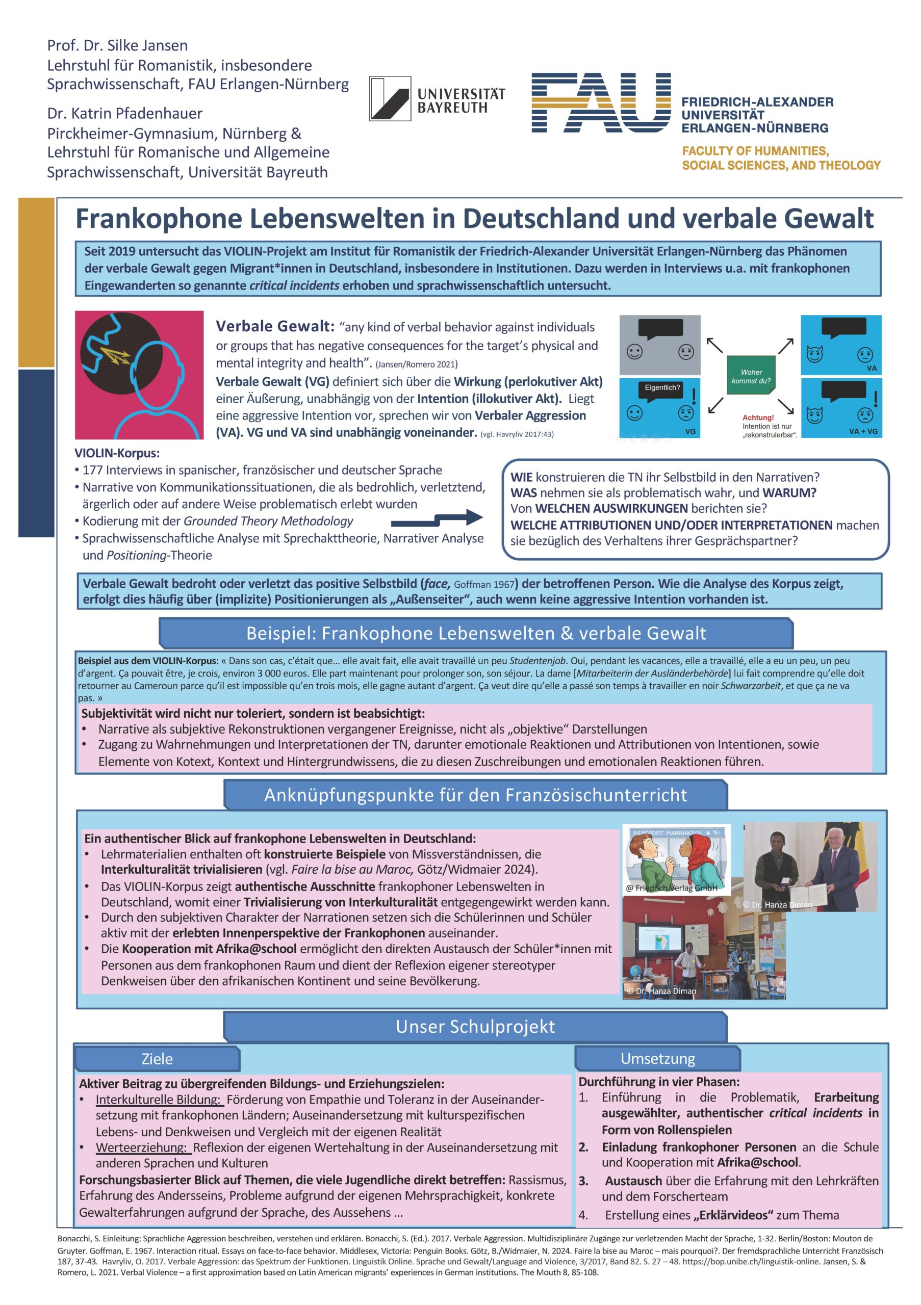 Pfadenhauer, K., & S. Jansen (2024). Frankophone Lebenswelten in Deutschland und verbale Gewalt. Poster from the collaborative work between the Chair of Romance Languages at the FAU and the Pirckheimer-Gymnasium in Nuremberg. Price: „Les bonnes idées – De l’école à la fac“, awarded by the Frankoromanistikverband in Passau (2024). [Link zum Beitrag (FAU)] [Link zum Poster]
